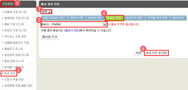 ①~④ 순서대로 관리자 로그인 > 주문관리 > 배송관리 > 국가선택 > [배송비관리]탭 선택 ⑤ 이용하실 택배사를 선택 해 주세요. ( 기본제공 배송 3사 : 몰테일 (메이크샵), 우체국EMS, 우체국 국제소형소포 ) ⑥ 표준가격 동기화 버튼을 눌러주세요.