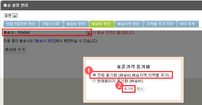 전체동기화 > 동기화 버튼을 눌러 진행해주세요 동기화시 [배송비관리][배송지역관리][지역별국가설정]도 함께 설정되는데요, 이 동기화를 거치지 않으면 배송비가 책정되지 않기 때문에 반드시 표준가격 동기화를 진행하셔야 합니다.