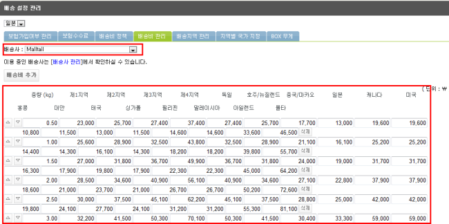 동기화가 끝나면, 해당 배송사의 무게별 요금표가 나타납니다. (운영하시는 국가별, 업체별로 동일하게 각각 진행 해 주셔야 합니다.)