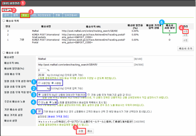 ① 일괄상품 무게 설정여부 : 주문상품에 일괄적으로 무게를 부여하는 기능입니다. (상품 개별데이터에 무게가 없고, 일괄무게도 없으면 상품무게는 "0kg" 이기 때문에, 고객 결제시 해외배송요금이 포함되지 않습니다 ) ② 일괄상품무게 입력 : ① 일괄상품 무게 설정여부 에서 '사용함'을 선택했을 경우 각 주문상품에 일괄 부여할 무게를 입력해주세요 ( ex. 일괄상품무게 1kg / 박스무게 2kg 설정시, 고객이 3개의 아이템을 구매했다면 상품무게 3kg+ 박스무게 2kg = 총 5kg의 해외배송요금을 지불하게 됩니다. ) ③ 일괄상품무게 적용방식 : 하단의 안내 참고하여 적용 방식을 선택합니다. 가급적 (추천)방식사용을 권장합니다. ④ 주문시 배송사 노출 : '노출' 선택시 ⑥ 배송사 사용여부 O로 활성화 되며, 노출한 배송사를 주문시 회원이 선택할 수 있습니다. ⑤ 기본 배송사 설정 : 다수의 배송사가 제공 될 때, 그 중 기본으로 설정될 배송사에 체크합니다. (미체크시 우체국 EMS 기본설정) ⑥배송사 사용여부: 제공 배송사를 확인할 수 있습니다. 활성화(O)된 배송사 중에 고객이 배송사를 선택하여 주문합니다.