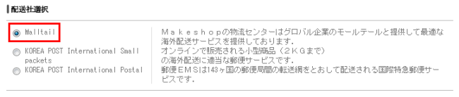 ■ 각 배송사 별로 아래와 같은 배송사 소개가 각 언어로 번역되어 기본 제공되며, 배송비 결제시 고객에게 노출됩니다. 해당문구는 관리자에서 원하시는 문구로 수정가능합니다. - Malltail (메이크샵 물류센터) : 메이크샵 물류센터는 글로벌 기업 몰테일과 제휴하여 고품격 해외 배송서비스를 제공합니다. - KOREA POST International postal (우체국 EMS) : 우체국 EMS는 143국 우체국간의 우편전송망을 통해 배송되는 국제특급 우편서비스입니다. - KOREA POST International Small packets (우체국 국제우편 소형포장물) : 온라인으로 판매되는 소형물품(2kg까지)의 해외배송에 적합한 우편서비스입니다.