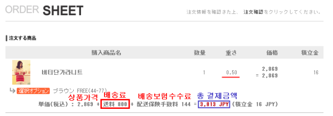 ■ 회원 결제창에서 설정한 배송정보가 노출/반영 됩니다. 주문시 위와 같이 구매한 상품 가격과 상품+박스 무게에 따른 국제 배송료, 그리고 배송보험수수료(설정시)에 따른 총 결제금액이 표기 됩니다.